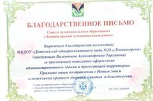 Наш детский сад занял первое место в конкурсе "Снежных дел мастер" и получил благодарственное письмо главы администрации города за праздничное новогоднее оформление детского сада и прилегающей территории.