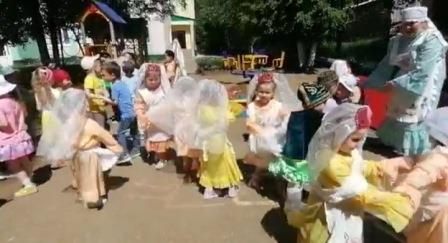 В Детском саду № 20 стало традицией в начале июня проводить праздник Сабантуй. В празднике приняли участие дети всех возрастных групп. Праздник подготовили воспитатели II младшей национальной группы Афандиева Л.М., Минахметова З.Р. и воспитатель по обучению татарскому языку Зиганшина Р.Я. В гости к нам за праздник заглянул сказочный герой – Антошка и татарская красавица – Айсылу. Ребята показали свою ловкость и умения в национальных играх «Кульяулыгым», «Бег в мешках», «Кто быстрее донесёт воду в пиалах», «Перенеси яйцо в ложке», «Перетяни канат», «Конные скачки», «Разбей горшок». Самым сложным для ребят, оказалось, попасть по горшку с закрытыми глазами, но и с этим испытанием они справились! А затем вместе с гостьей праздника – татарской красавицей Айсылу, воспитанники водили хоровод и танцевали под национальную музыку. Разгадывали множество интересных загадок от Айсылу. В заключении мероприятия организовали межнациональный флешмоб для малышей. Ребята веселились от души. Ведь много ли надо детям для счастья! Праздник удался на славу! И конечно же в конце праздника дети получили сладкое национальное угощение - хворост.