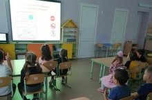 Минахметова З. Р. разработала интерактивную игру "Остановка безопасности", в которой детям предлагалось рассмотреть дорожные ситуации, правильно определить дорожный знак, какой знак необходим в той или иной ситуации. Детям эта форма игры наиболее интересна, поскольку всё мероприятие прошло в игровой форме, в виде нашего путешествия.