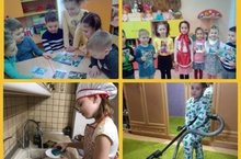 Дошкольники предложили гостье сыграть с ними в подвижные игры: «Собери мусор», «Постираем платочки», «Починим мебель». Вместе с Красной Шапочкой они просмотрели презентацию «Домашние обязанности всех членов семьи». При проведении психогимнастики «Мамино настроение» ребята рассказали о словах и поступках приносящих радость близкому человеку. В подарок гостям группы и родителям воспитанниками был составлен коллаж на тему «Как я помогаю родителям по дому».
