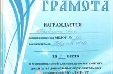 Воспитанница подготовительной к школе группы Гарайшина Лия (воспитатели Бреднева А.В., Гаврилова Т.А.) заняла 2 место в муниципальной олимпиаде по формированию элементарных математических представлений.