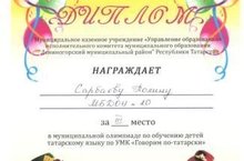 Сегодня в МАДОУ № 7 состоялась муниципальная олимпиада по обучению детей татарскому языку по УМК "Говорим по-татарски", где приняла участие наша воспитанница подготовительной группы Сарбаева Полина (воспитатель по обучению детей татарскому языку Зиганшина Р.Я.). По итогам олимпиады Полина заняла 3 место и была награждена дипломом. Поздравляем Полину и желаем дальнейших успехов!