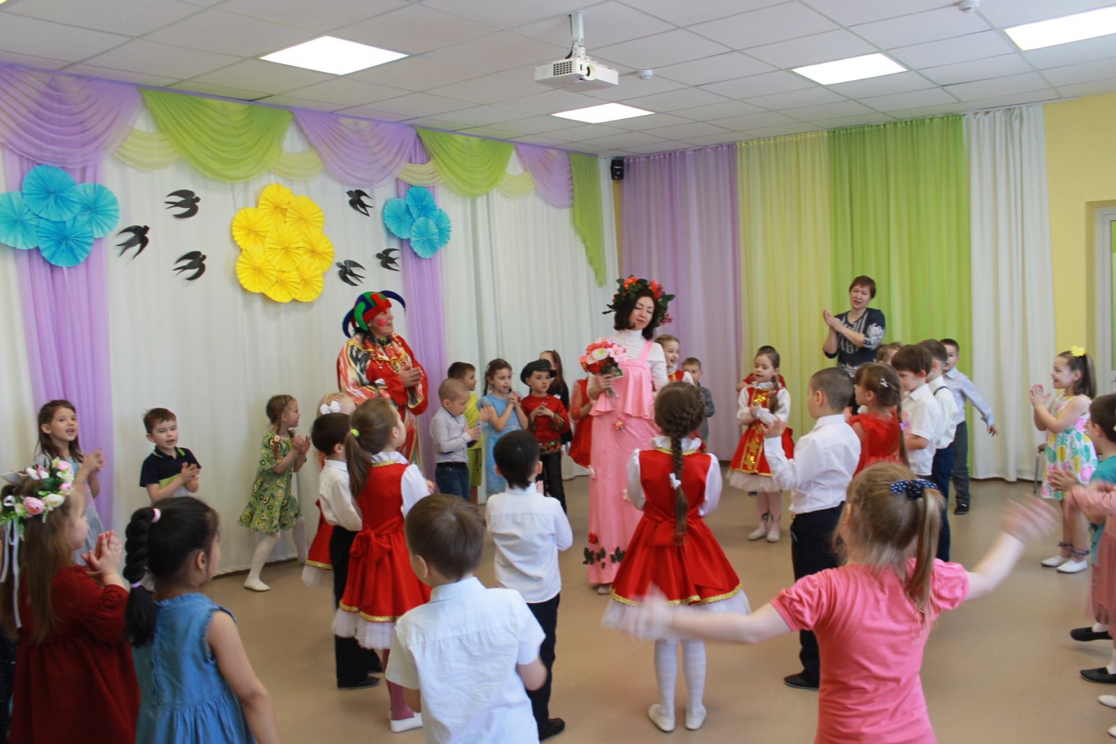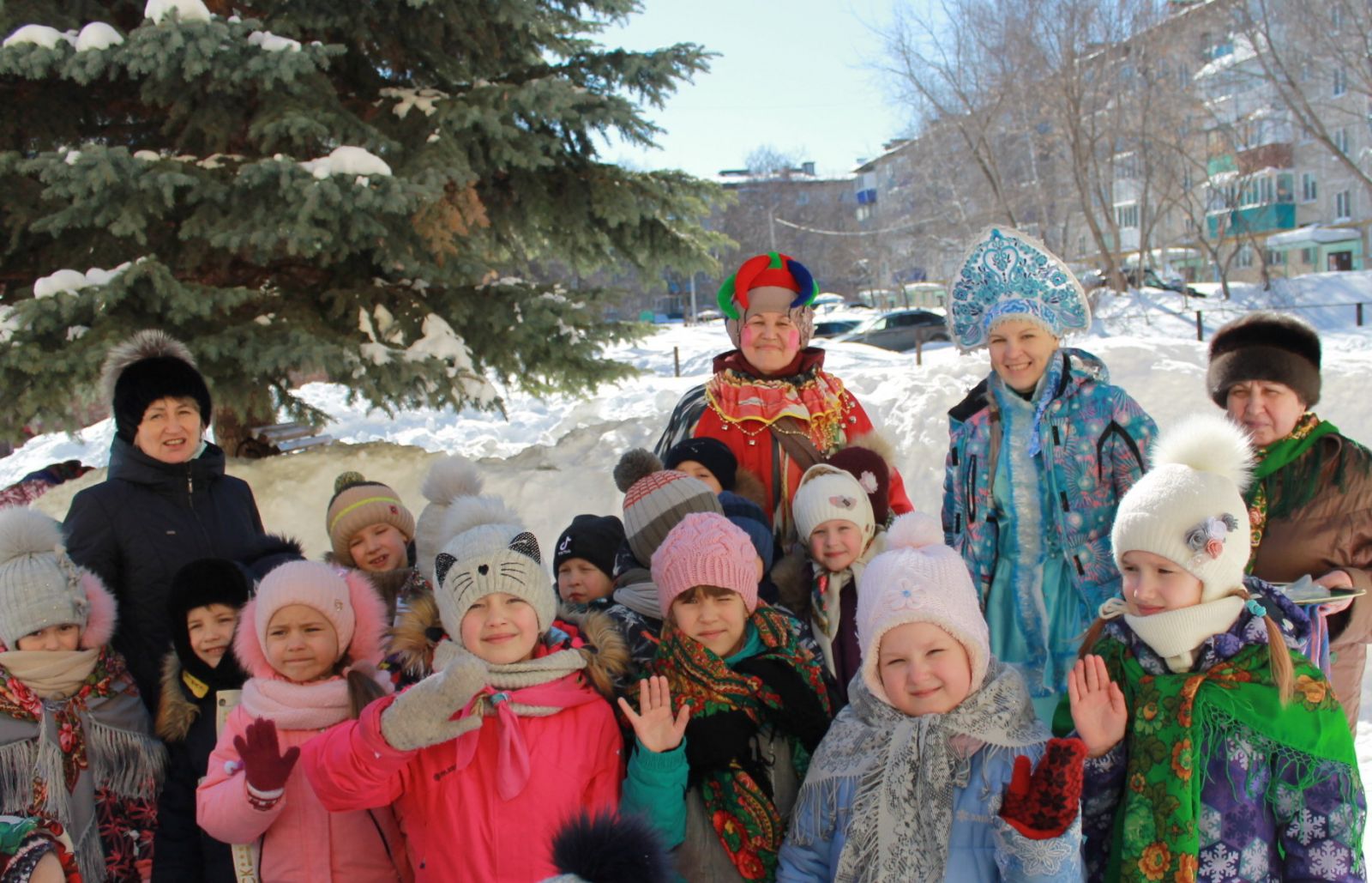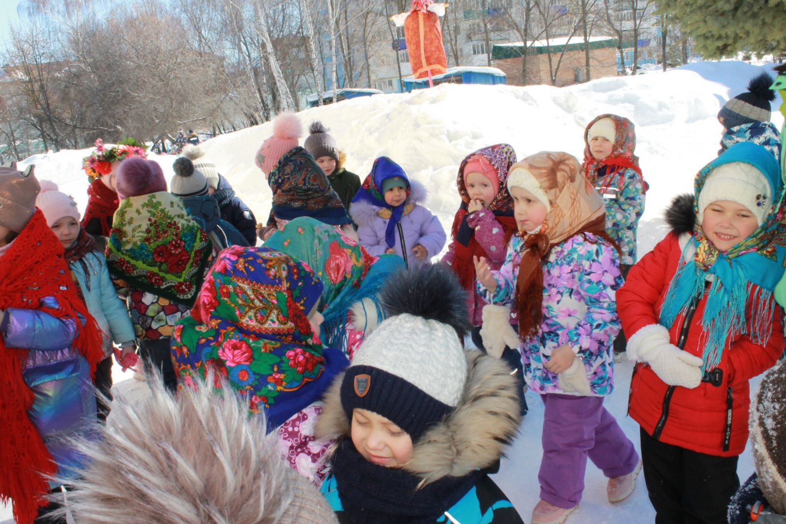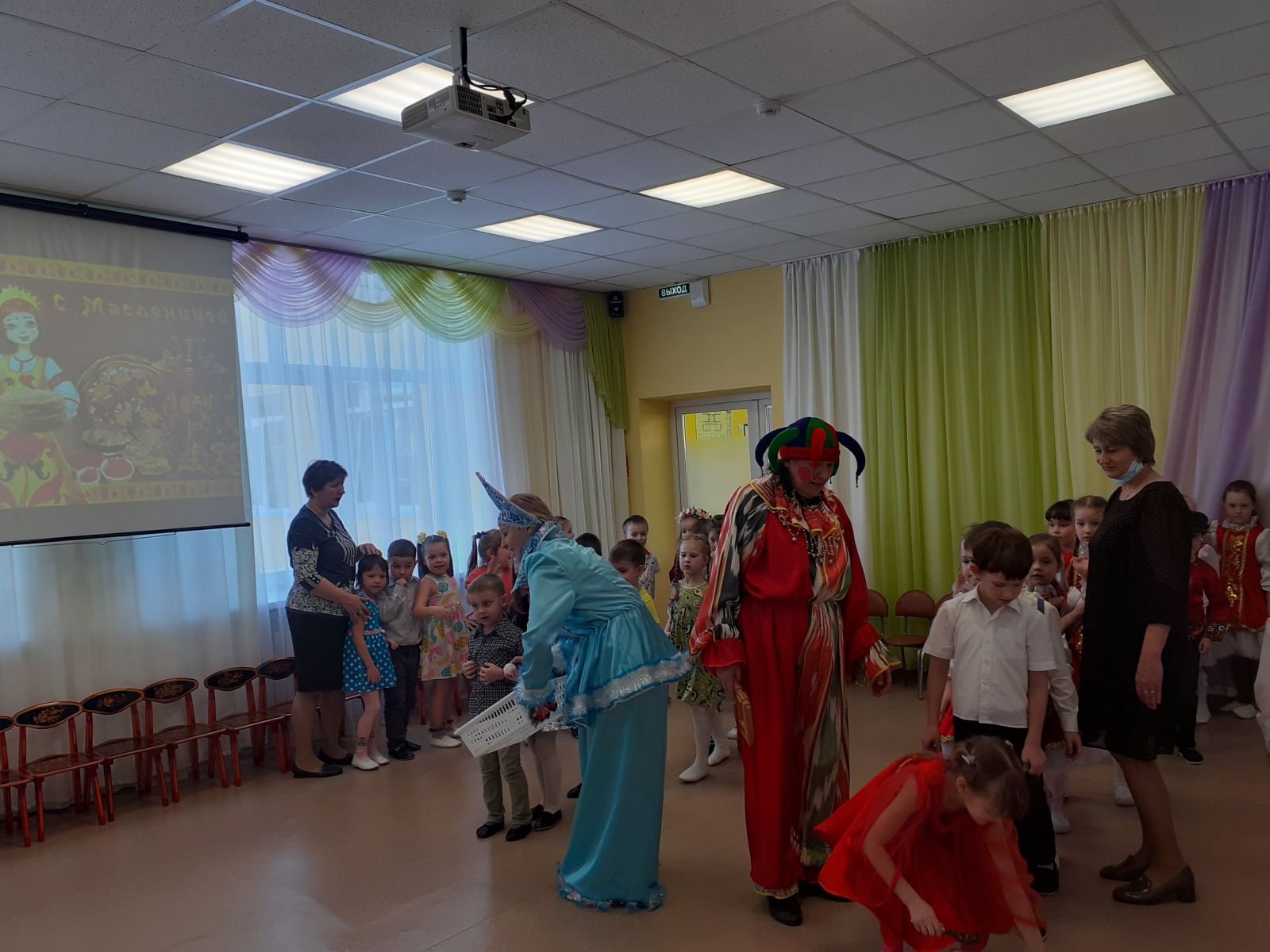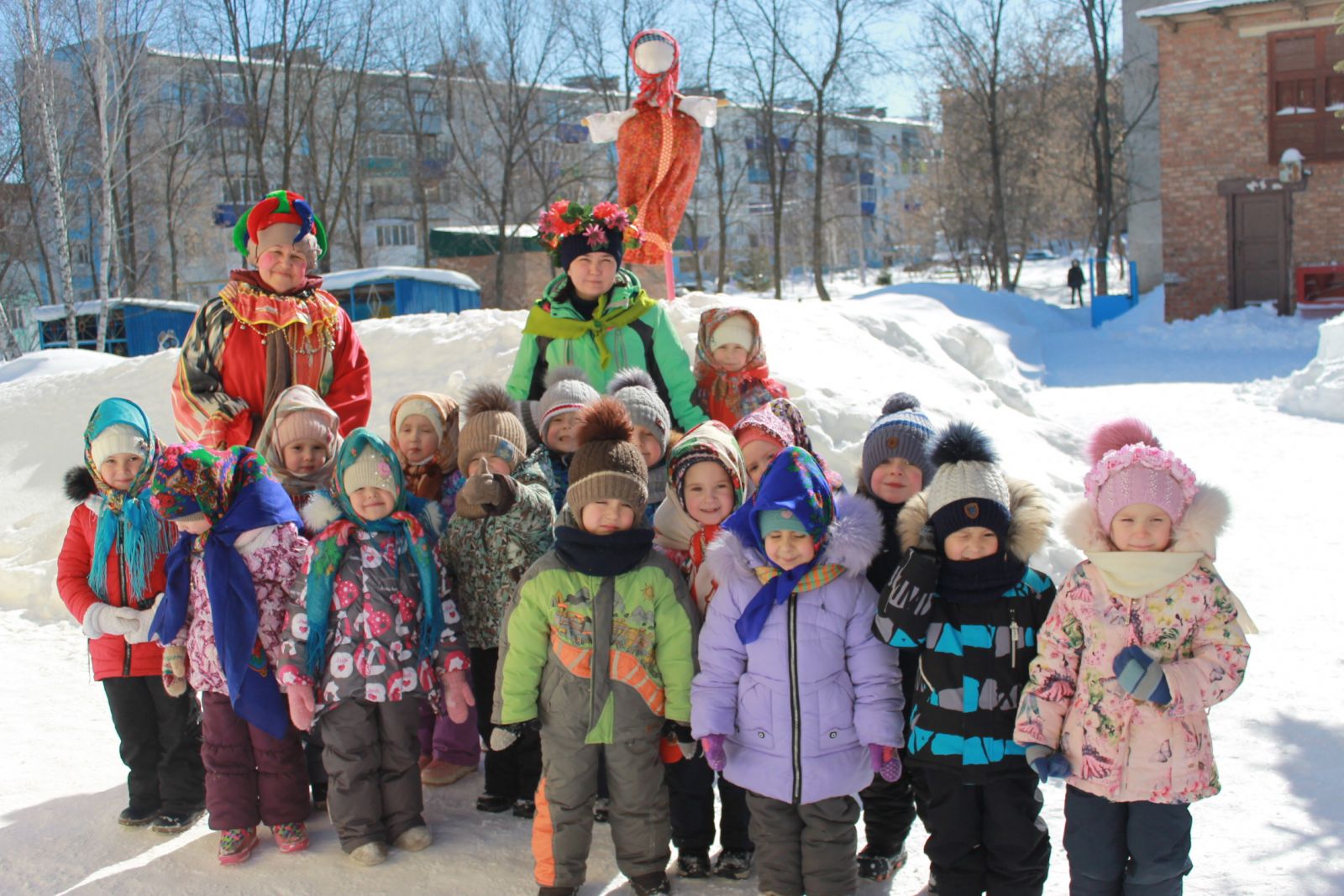 Балалар бакчасында күңелле кычкырулар, масленица шаярулары, җырлар, табышмаклар, уеннар һәм алсу коймак белән Майчабуны каршы алдылар. Һәр яшь төркеме балалары белән музыка залында бәйрәм күңел ачулары үткәрелде, аларда Скоморохлар, Аю, Кыш, Яз персонажлары катнашты. Балалар яз турында җырлар җырладылар, рус халык уеннарын уйнадылар, әйлән-бәйлән уйнадылар. Бәйрәм азагында һәммәсе урамга чыгып, тәмле хуш исле, алсу коймак ашадылар, рус халык җырларына биеделәр. Бәйрәм күңелле һәм шатлыклы булды!