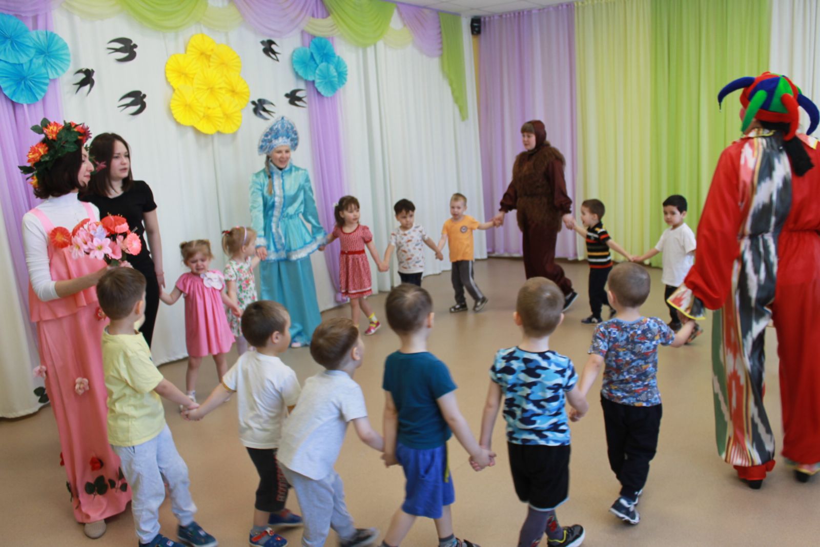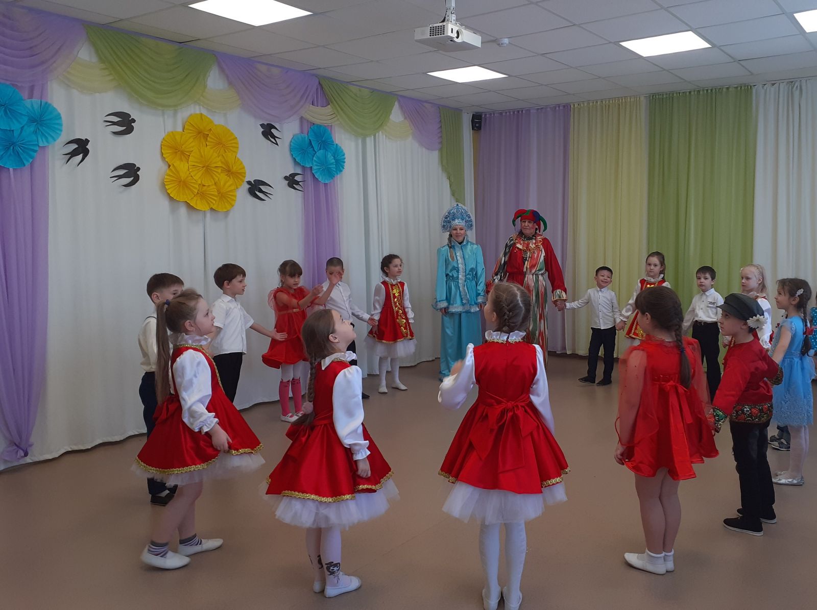 С детьми каждой возрастной группы в музыкальном зале были проведены праздничные развлечения, в которых приняли участие персонажи: Скоморохи, Мишка косолапый, Зимушка-Зима, да Весна-Красна. Ребята пели песни о весне, играли в русские народные игры, водили хороводы. А в конце праздника все вышли на улицу, где дружно и с аппетитом кушали ароматные, румяные блины и плясали под русские народные песни. Праздник получился веселым и радостным!