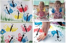 Воспитатель Гульнара Зядитовна, воспитатель первой младшей группы, в художественно-продуктивной деятельности с детьми очень часто использует нетрадиционное рисование. Особенно малышам нравиться делать отпечатки ладошками. Рисование ладошками развивает мелкую моторику, что очень важно для развития речи. Шлеп-шлеп и получилась…ну, конечно же, красивая бабочка! Казалось бы, просто. А сколько позитива и положительных эмоций получают маленькие воспитанники от этого занятия. Ребенок учится свободе творчества, абстрактно мыслить, изучает цвета и формы. Вот какие бабочки получились!