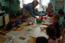 Дети подготовительных к школе групп, под руководством воспитателей, месили и раскатывали тесто, а затем придавали ему форму птиц. Затем готовые изделия испекли. Получилось праздничное вкусное угощение!.