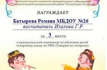 В МБДОУ №7 прошла муниципальная олимпиада по обучению детей татарскому яызку "Говорим - по татарски". Наш воспитанник Батырев Роман под руководством воспитателя Илаловой Гульназ Рузматовны достойно отстоял честь детского сада и занял 3 место. Поздравляем воспитанника и воспитателя с достижением!