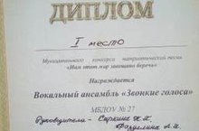Поздравляем вокальный ансамбль "Звонкие голоса", занявший 1 место в муниципальном конкурсе патриотической песни "Нам этот мир завещано беречь!"