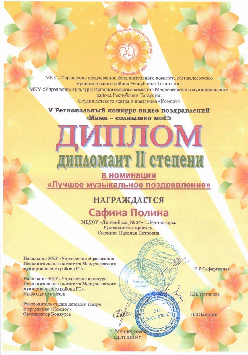 Поздравляем победителей V регионального конкурса видео поздравлений "Мама - солнышко моё!" (воспитатель Фазуллина Л.И., музыкальный руководитель Сыркина Н.П.):