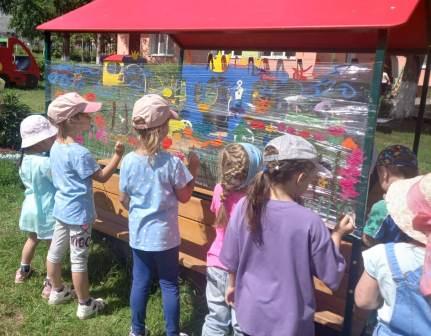 На прогулке, опираясь на карточки с изображением деревьев, искали похожие деревья. С удовольствием рисовали гуашью бабочек, цветы, деревья, облака, солнышко на натянутой пищевой плёнке. Все были увлечены творчеством. А какая замечательная совместная картина получилась!