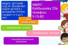 МБДОУ «Детский сад комбинированного вида №29» продолжает набор детей в 1 младшую группу (Возраст от 2 до 3 лет). Мы предлагаем качественные образовательные услуги, ежедневный медицинский осмотр, пятиразовое сбалансированное питание, развивающие занятия. Наши двери открыты для Вас и ваших малышей!