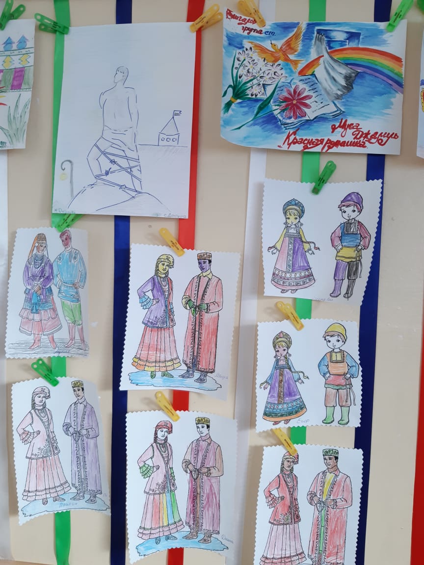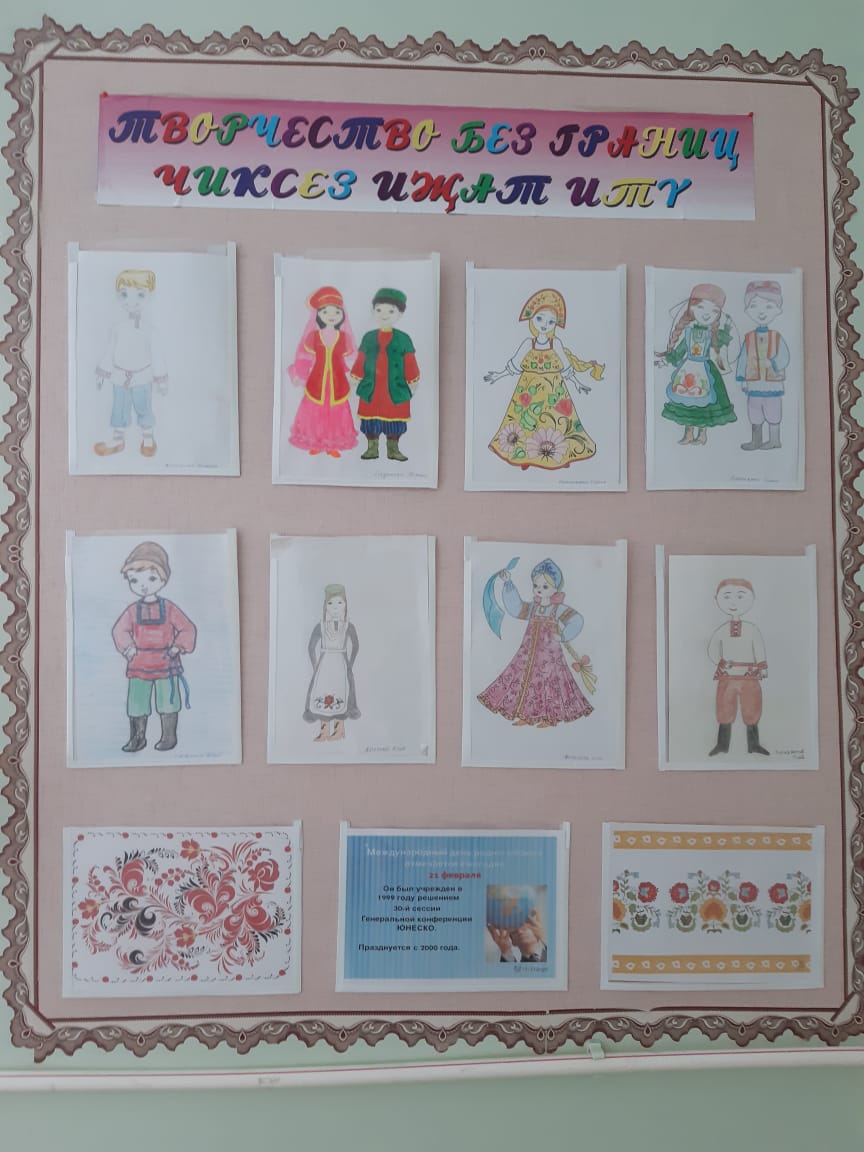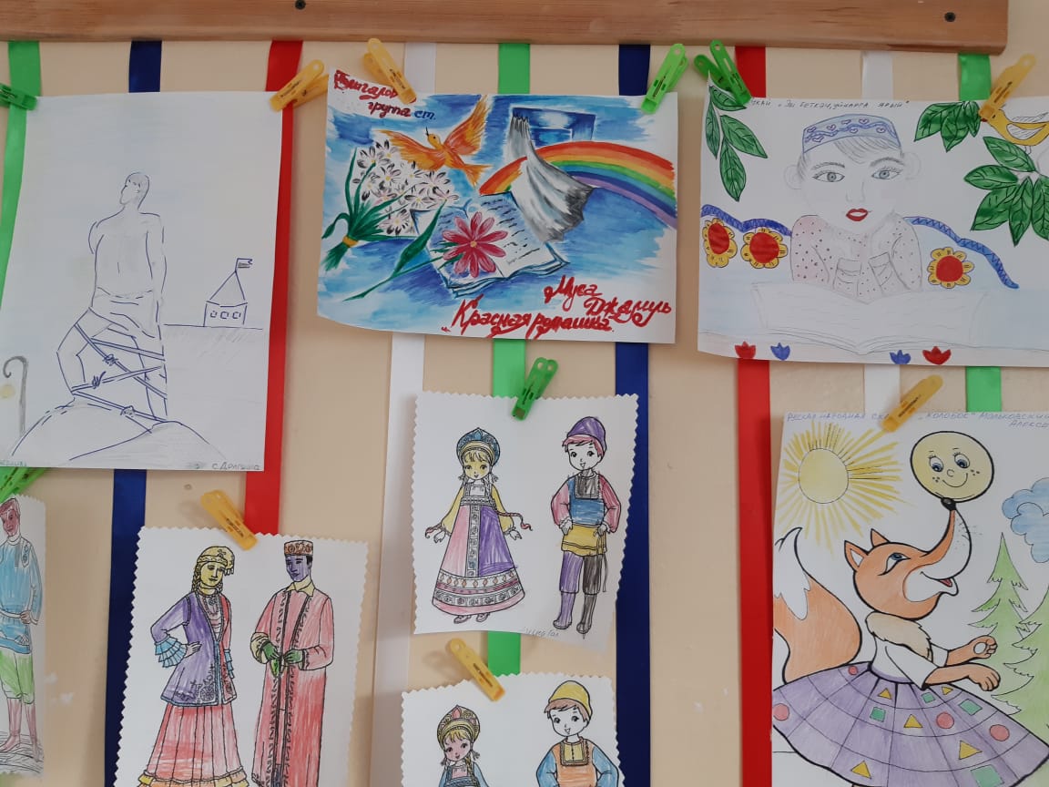 Во всех группах и музыкальном зале детского сада была организована выставка рисунков на тему «Родной язык – наше богатство», цель которой воспитание интереса и уважения к родному языку и языковой толерантности посредством художественного творчества. Ребята всех возрастов приняли участие в выставке и показали через рисунки любовь и уважение к своему родному языку.
