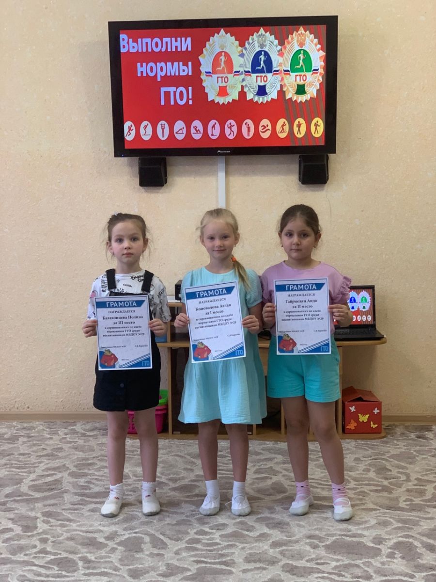 В ноябре и декабре 2023 воспитанники 6-7 лет приняли участие в соревнованиях по сдаче нормативов ГТО среди воспитанников МБДОУ №29. После сдачи нормативов Были выявлены победители и призеры. Среди девочек: