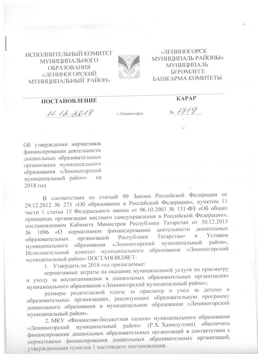 К А Р А Р П О С Т А Н О В Л Е Н И Е №1719 от «11» декабря 2017г. Об утверждении нормативов финансировании деятельности дошкольных образовательных организации муниципального образования «Лениногорский муниципальный район» на 2018 год