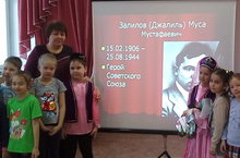 15 февраля – День памяти великого татарского поэта-героя Мусы Джалиля. Наши воспитатели и воспитанники вспоминали творческий и боевой путь доблестного воина и талантливого поэта. Дети прочитали его стихи, прослушали поэтическое посвящение дочери героя Чулпан, узнали о трагической и, в то же время, героической судьбе узника фашисткой тюрьмы Моабит. В конце встречи воспитанница подготовительной к школе группы Шаммасова Диана выступила с посвящением своему прадедушке – герою войны Резяпову Исхаку Шагутдиновичу, прошедшему, так же как и великий Джалиль, тяжелый путь защитника Родины. Добрая память о героях живет в наших сердцах!