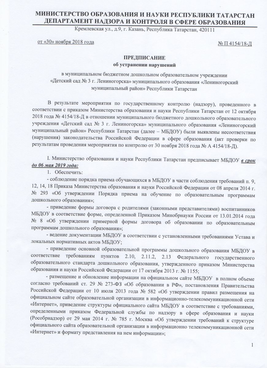 Уведомление об исполнении Предписания департамента надзора и контроля в сфере образования