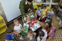 Сегодня дети младшей группы встретились с курсантом, военно-патриотического клуба «Беркут», Ахметзяновым Артемом, который познакомил детей с "Музеем в чемодане". Дети с интересом слушали рассказ о солдатской жизни в военное время, рассматривали военные принадлежности, примеряли головные уборы, а так же провели игру "Разведчики".