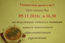 09.11.16 прошла дегустация детского питания с участием представителя ОАО "АльТрейд" Были представлены блюда десятидневного меню, старшая медсестра ознакомила с технологическими картами, а также родители имели возможность задать вопросы по питанию поварам.
