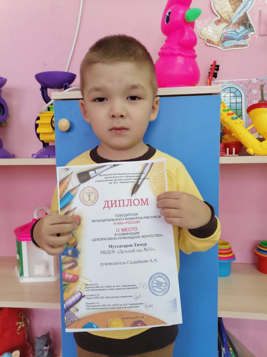 Поздравляем воспитанников подготовительной группы Мухтасарова Тимура (воспитатель Садыйкова А.А.) и Аюпову Амилю (воспитатель Кашапова А.И.) с победой в муниципальном конкурсе рисунков «Я+МЫ=РОССИЯ»