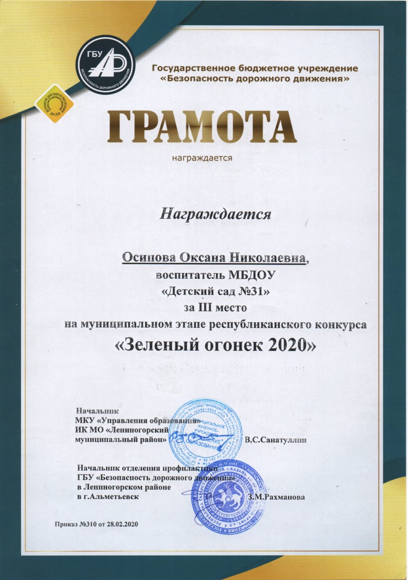 Наша воспитательница Осипова Оксана Николаевна стала призером (3 место) в муниципальном этапе республиканского смотра-конкурса " Зеленый огонек-2020" Поздравляем! Желаем не останавливаться на достигнутом, всегда двигаться вперед, покорять любые вершины. Пусть на пути к успеху Вам всегда светит счастливая звезда!