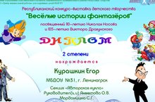 Дети нашего детского сада приняли участие в Республиканском конкурсе-выставке детского творчества «Весёлые истории фантазёров», посвящённого 105-летию Виктора Драгунского и 110-летию Николая Носова в рамках IX Республиканского конкурса исследовательских работ и проектов школьников «Дебют в науке», учредителем которого явилось Управление образования Исполнительного комитета Нижнекамского муниципального района РТ; ГАУ «Республиканский олимпиадный центр» МОиН РТ.