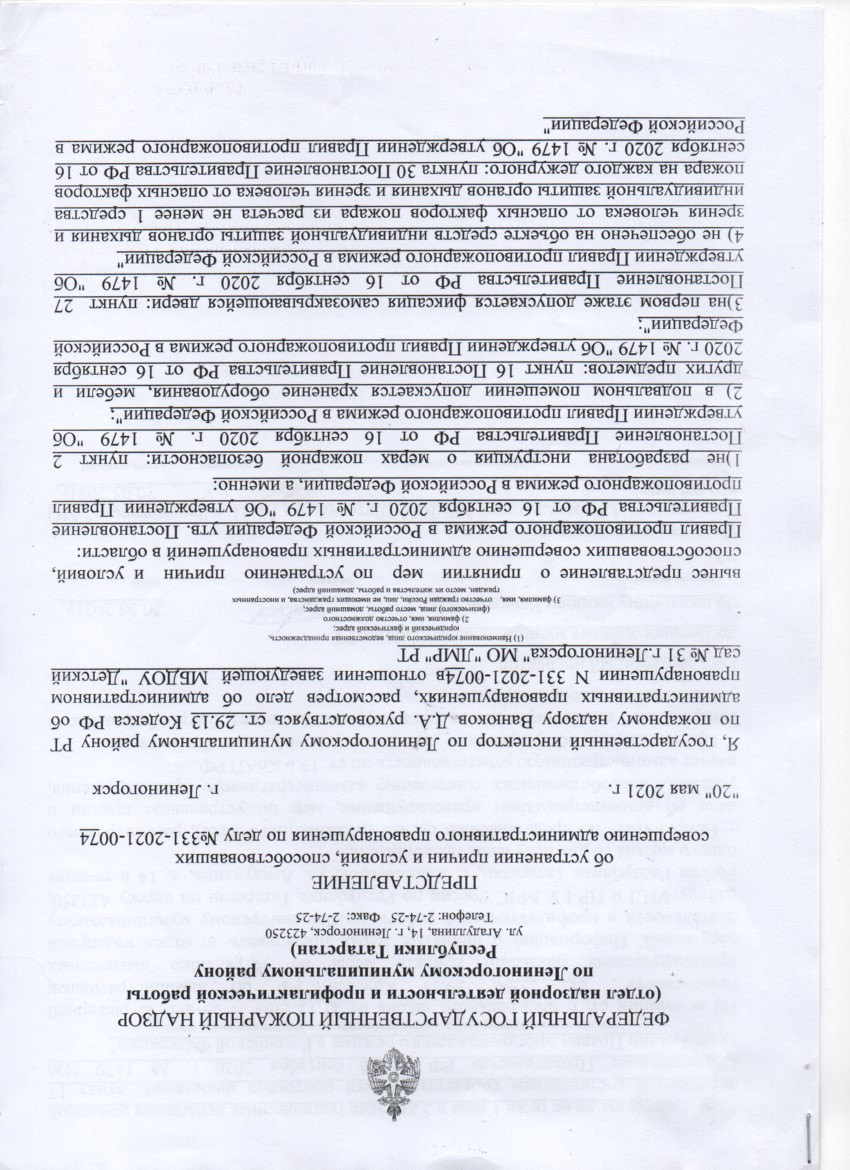 Предписание об устранении причин и условий, способствовавших совершению административного правонарушения по делу № 331-2021-0074