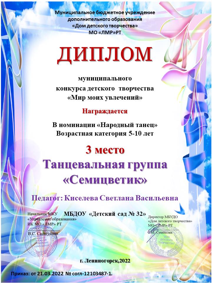Поздравляем Светлану Васильевну, музыкального руководителя и танцевальную группу «Семицветик» с III призовым местом в муниципальном конкурсе детского творчества «Мир моих увлечений» в номинации «Народный танец».