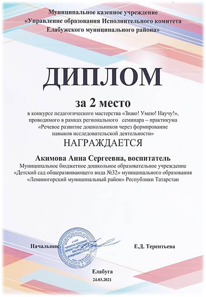 В конкурсе педагогического мастерства “Знаю! Умею!Научу!”, проводимого в рамках Регионального семинара-практикума “Речевое развити дошкольников через формирование навыков исследовательской деятельности ”. Воспитатель Акимова А. Н., заняла 2 место.