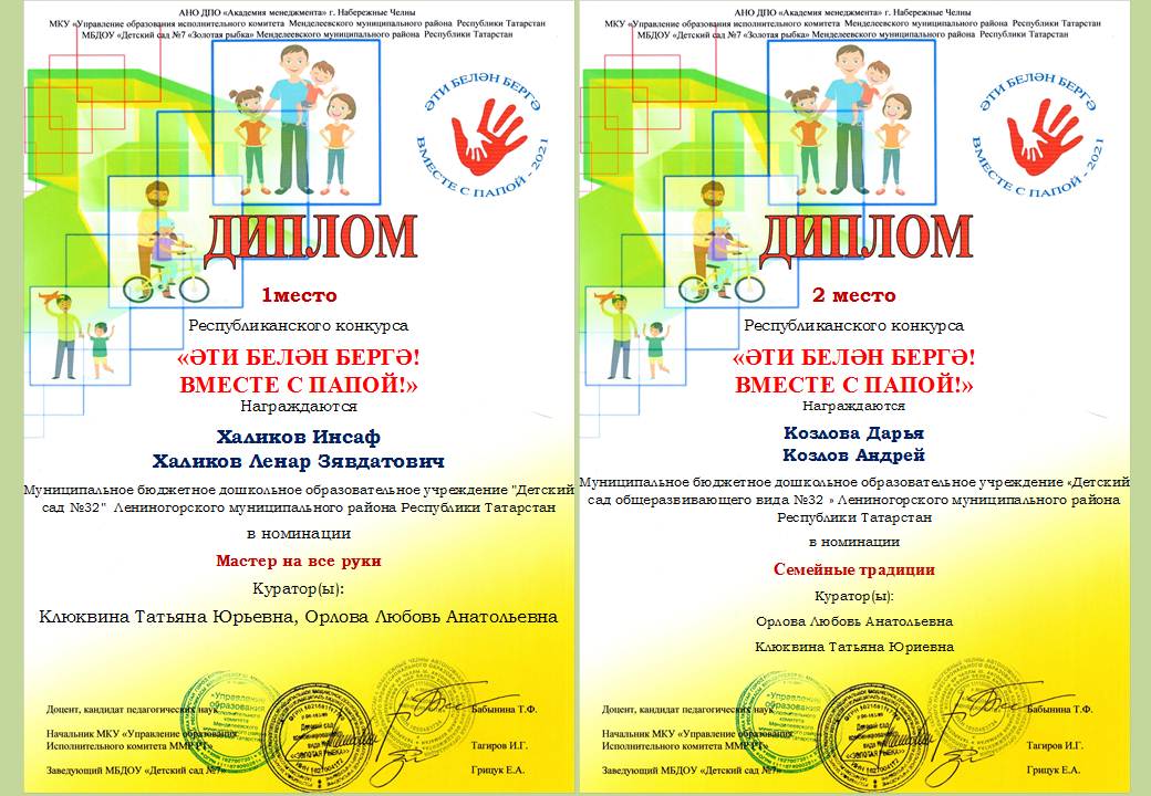 Семьи наших воспитанников Халиковых Инсафа и Козловых Дарьи приняли участие в Республиканском конкурсе "Әти белән бергә! Вместе с папой!", где заняли почётное I и II меcто! Поздравляем наших воспитанников и их пап с призовыми местами. Выражаем благодарность нашим педагогам и родителям за активное участие! Желаем дальнейших успехов!