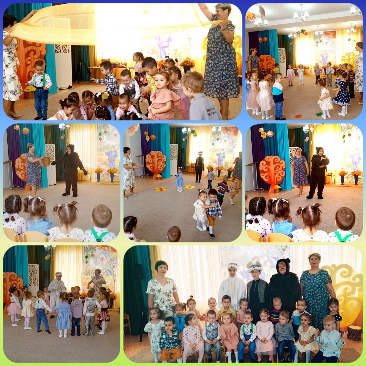 Көзге бәйрәмне "Звездочки" төркеме Аю һәм Куян белән каршы алды. Балалар уйнадылар, җырладылар, биеделәр, хәтта урман кешеләренә уңыш җыярга булыштылар.