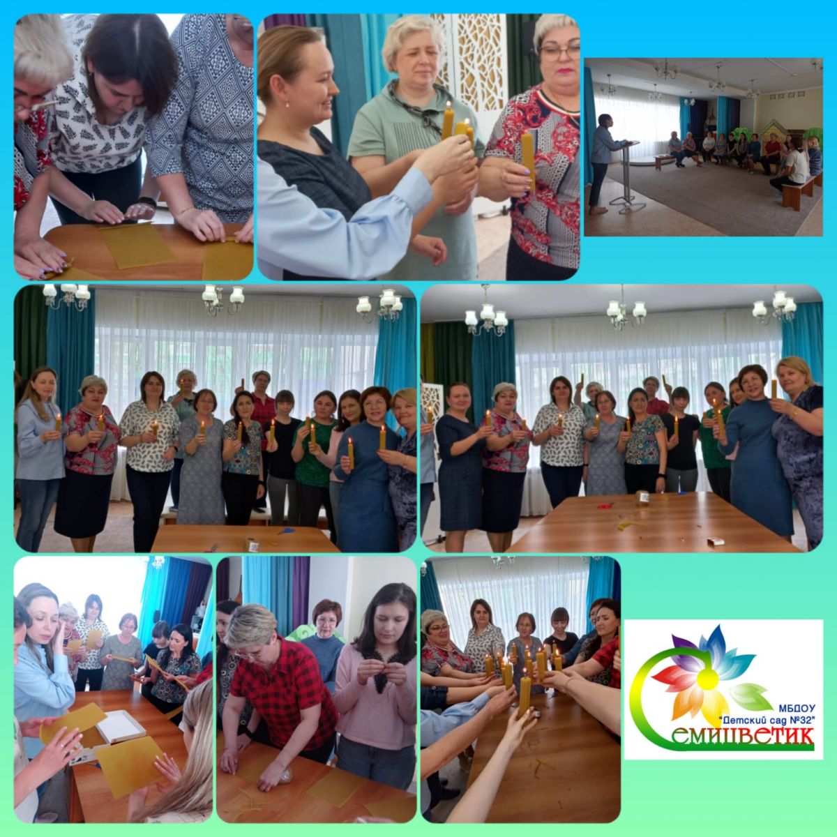27 апреля педагог-психолог Самарина А.Ю. провела психологический тренинг для педагогов "Пасхальная свеча", где были проработаны приемы сбрасывания негативных эмоций. А так же педагоги получили навыки при работе с вощиной, изготовили свечи своими руками и получили заряд положительных эмоций.