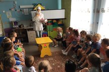 В завершении познавательной недели детей из групп "Радуга "и "Звёздочки " посетил сотрудник НИИ, профессор Почемучкин.Он узнал,что дети нашего сада очень любознательны, являются маленькими исследователями и хотел в этом убедить Дети продемонстрировали ему знания о свойствах воды,песка,воздуха,магнита.Обьяснили и показали почему горит фонарик.Не забыли рассказать об искусственном и природном источниках света.Профессор Почемучкин был удивлён знаниям детей и предложил дальнейшее сотрудничество.