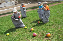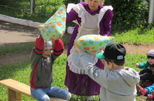 Дружно, весело играть!О Сабантуе можно рассказывать много, но лучше принять в нем участие. Звонкая музыка собрала всех воспитанников детского сада. В основе праздника был увлекательный сюжет. Ребят веселил хвастливый и шустрый Шурале. Но главное здесь – это состязания: перетягивание каната, бег в мешках, «скачки на лошадях» и др. Дети получили заряд бодрости и хорошего настроения. -
