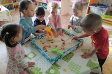 На сегодняшний день песочная терапия очень распространенная и доступная форма работы с детьми, которая дает значительные положительные результаты. В первую очередь песочная терапия оказывает положительное влияние на развитие речи, мышления, познавательных процессов и творческих способностей детей. Воспитанники группы "Звёздочки", которые впервые в этом году пришли в детский сад, знакомятся с особенностями песка, его свойствами (сыпучесть, рыхлость, способность пропускать воду), приемам и способам изображения с использованием песка. Развивающие занятия на песке эффективнее, чем стандартные приёмы обучения. Они находят большой отклик у детей. -
