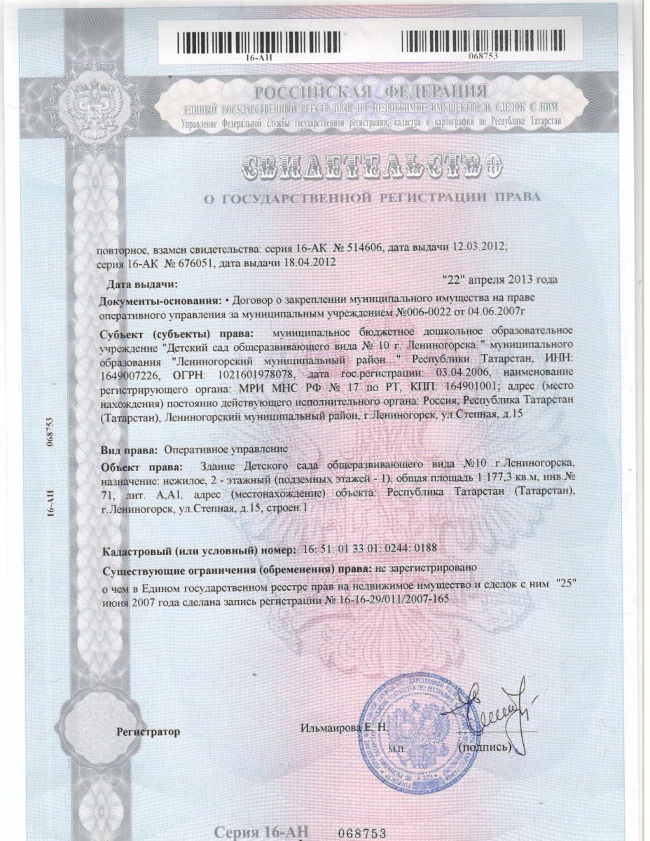 Свидетельство о государственной регистрации права на здание №1 /upload/storage/org4033/files/7 001(13).jpg