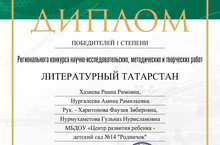 Поздравляем наших победителей: воспитателей Ф.З. Харитонову и Г.Н. Нурмухаметову победителей 1 степени республиканского конкурса научно-исследовательских и творческих работ "Мой Татарстан". Желаем им дальнейших успехов!