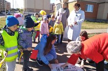 Проблема безопасности дорожного движения на данный момент является одной из достаточно важных проблем. В Татарстане увеличилось число дорожно-транспортных происшествий, которые происходят, к сожелению, с участием детей. Для того чтобы, привлеч внимание родителей и водителей к проблеме аварийности на дорогах нашего города и безопасносности юных участников движения, 21 сентября воспитанники группы "Светлячок" и "Звездочка" совместно с родителями и начальником отделения профилактики ГБД "БДД" в Лениногорском районе территориального управления в г. Альметьевске З.М. Рахмановой провели акцию "Пешеходный переход". Воспитанники, совместно с родителями, с помощью трафорета нанесли надпись на асфальте перед пешеходным переходом "Возьми ребенка за руку" . Подобная акция вызвала положительную реакцию, как у самих водителей, так и у проходивших мимо пешеходов.