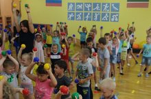 День в детском саду начался со всеобщей зарядки, в спортивном зале, взрослых и детей. Зарядка прошла под девизом "Если хочешь быть здоров - будь!!!" Во время зарядки разноцветные мячи сверкали как салют. Салют в честь здоровья!!!!