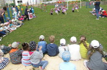 По настоящему летняя теплая погода мотивировала участников педагогического процесса - воспитанников с педагогами - к организации массовой акции по пропаганде здорового образа жизни, проведению детского фитнеса. Под руководством инструктора по физической культуре А.С. Галимовой и музыкального руководителя О.В. Семеновой воспитанники всех групп с воспитателями вышли на спортивную площадку ДОУ: выполняли комплекс ОРУ, полюбившиеся флеш-мобы, закончили акцию проведением одной из любимых коллективных игр "Весёлый паровоз". Хорошему настроению сопутствовали отличная погода, музыкальное сопровождение и массовое участие детей и педагогов в мероприятии.
