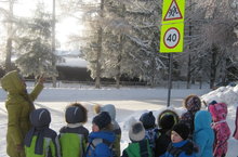 Подготовительная к школе группа, с целью закрепления знаний о дорожных знаках и правил поведения на дороге и на улице, вышла на экскурсию по нашему микрорайону.