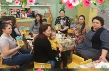 В теплой и домашней обстановке за чаепитием наши дети и мы-воспитатели группы поздравили любимых мам с предстоящим праздником!!!! Наши дети с помощью нас (воспитателей) изготовили поздравительное открытки для своих мам!!