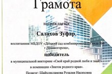 Салахов Зуфар, воспитанник подготовительной к школе группы, принял участие в муниципальной викторине "Свой край родной люби и знай!" и стал победителем в номинации "Знаток родного края"! Поздравляем!!!