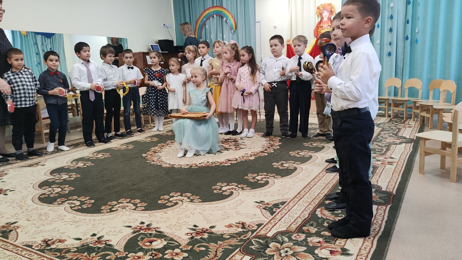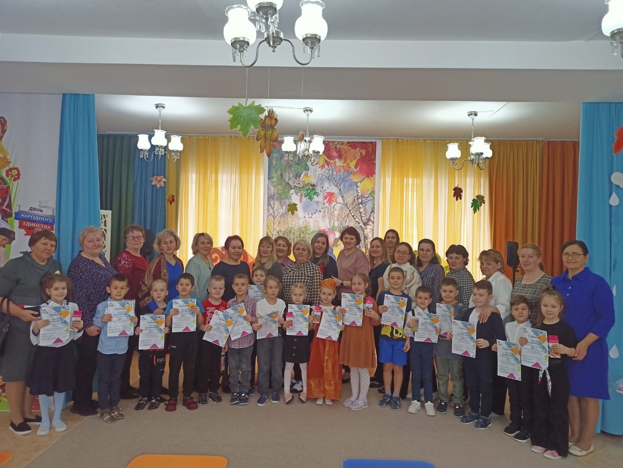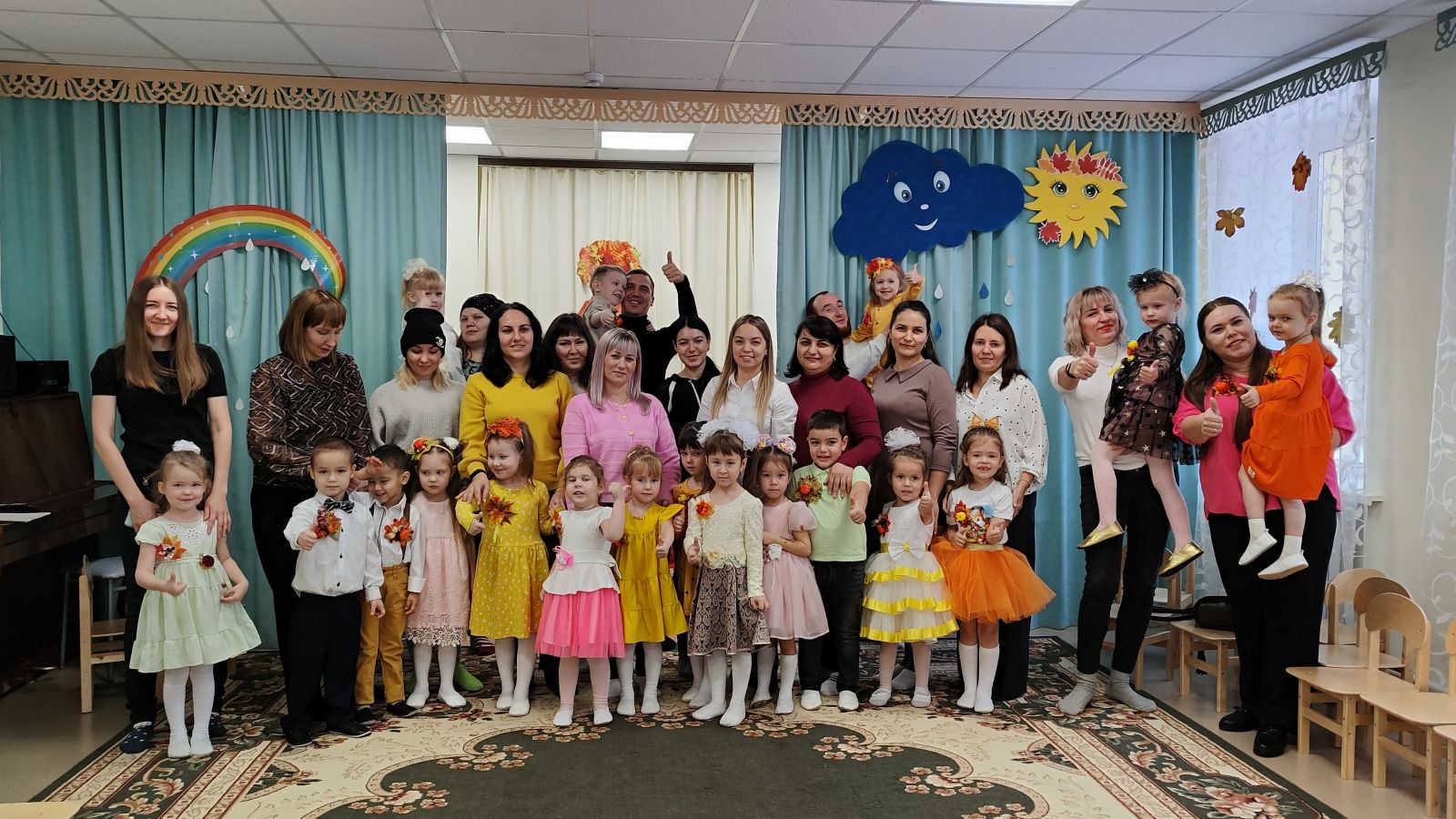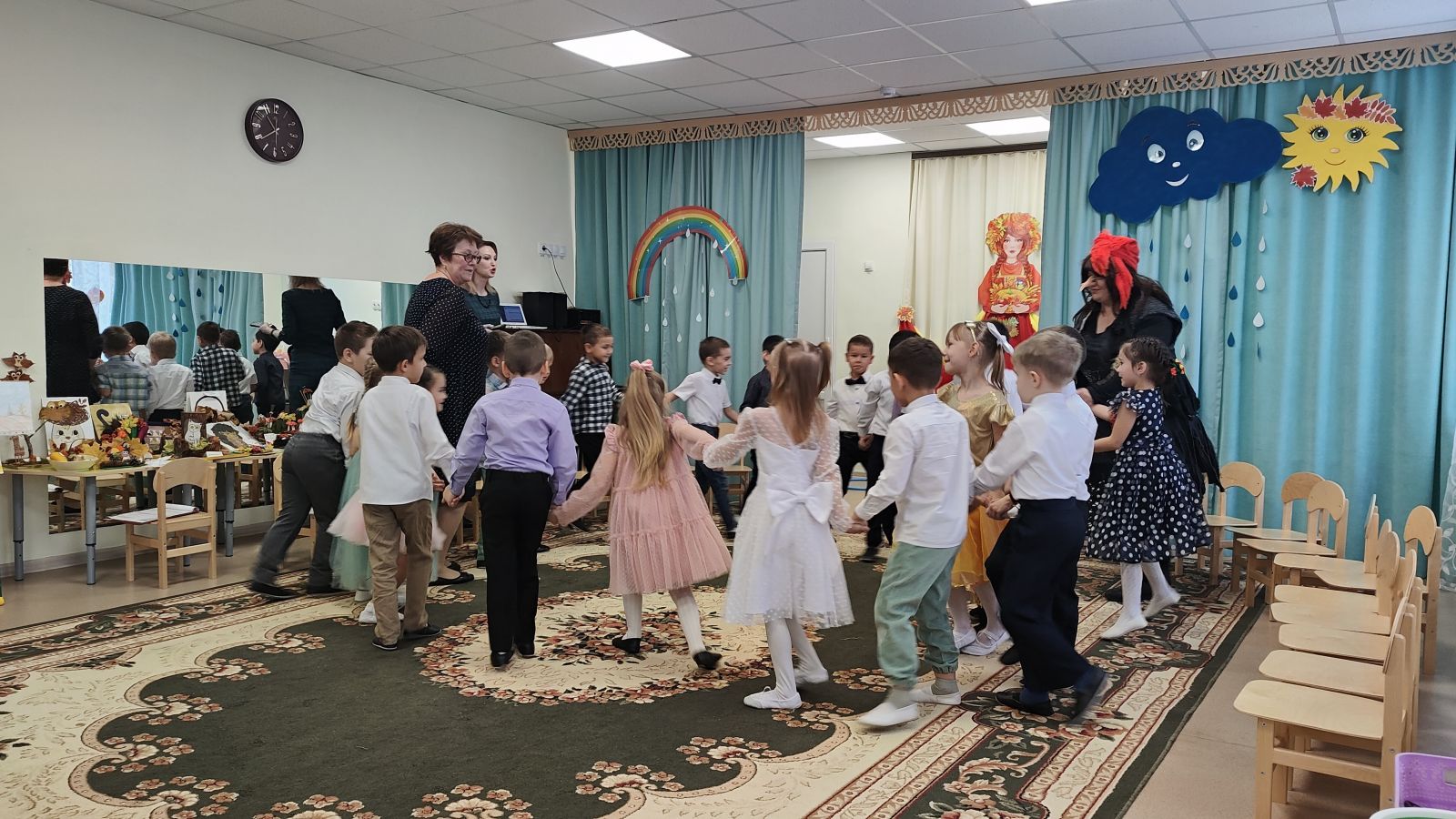 24-25 октябрьдә безнең балалар бакчасында барлык яшь төркемнәре өчен көзге бәйрәмнәр узды. Көз гүзәле һәр төркемгә зурларга да, кечкенәләргә дә күз салды, беркемне дә игътибарсыз калдырмады, ә балалар аны кадерле кунак кебек каршы алдылар җырлар, биюләр, әкиятләр, уеннар, шаяртулар һәм өстәмәләр белән! Балалар бакчасында Көз бәйрәме иң яраткан чараларның берсе булып тора, чөнки нәкъ менә тантаналы бәйрәмнәр вакытында балалар күңел ача да, башкаларга да карый һәм үзләрен күрсәтә дә ала. Көзне «кайчак күңелсез» дип атасалар да, залның якты бизәлешенә, яшел, сары, кызыл һәм көрән яфраклар белән эленгән агач макетына балалар кебек шатланалар. Сюрпризлар һәркемгә күптөрле якты тәэсирләр бирде. Әкияттәге персонажлар уеннар һәм күңелле мәзәкләр белән сөендерделәр. Ләкин, әлбәттә, нинди бәйрәм? Көз барлык яшь төркемнәрендәге балаларга тәмле алмалар алып килде. Бәйрәм шатлык һәм рәхәтлек китерде!