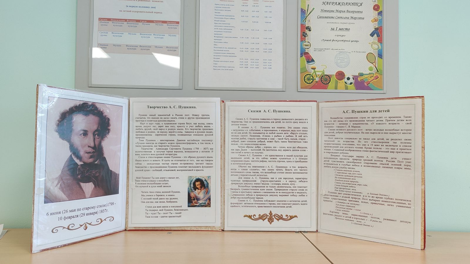 6 июнь көнне әдәби иҗатны яратучылар Александр Сергеевич Пушкинның туган көнен билгеләп үтәләр. Бу көнне балалар бакчасында А.С. Пушкин иҗатына багышланган төрле чаралар узды. Салманова С.М., Новикова М. В. тәрбияләнүчеләр өчен "А. С. Пушкин иҗаты буенча сәяхәт"дигән күңел ачу чарасы әзерләделәр. Төрле уеннар, табышмаклар, биюләр һәм "Салтан турында әкият"мультфильмын карау үткәрелде.