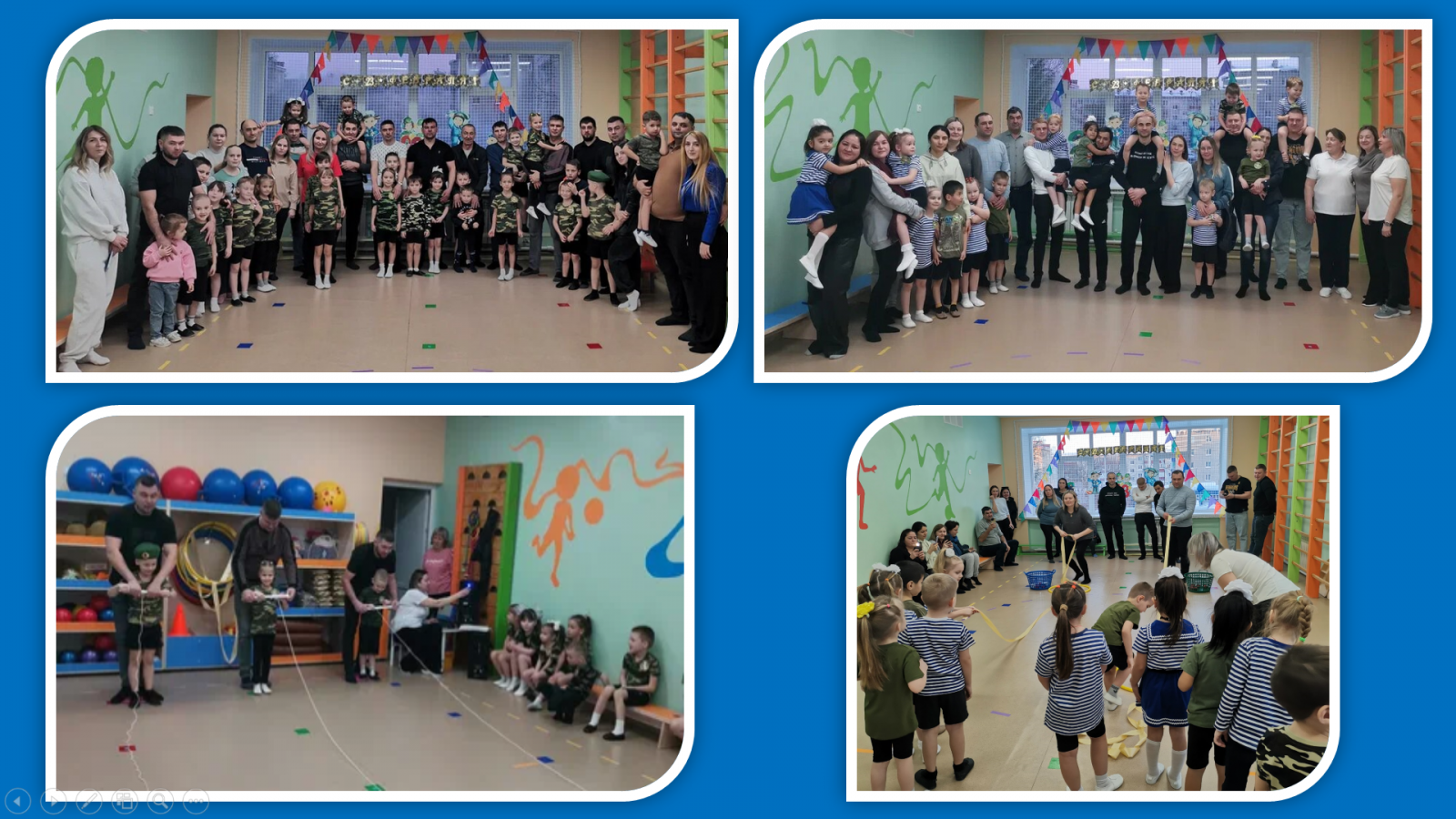 В подготовительной к школе группе инструктор по физической культуре Голунова Наталья Валерьевна, музыкальный руководитель Романова Елена Александровна, воспитатели Исаева Ольга Михайловна, Бормотова Анастасия Сергеевна провели спортивный праздник посвященный Дню защитника Отечества. Дети вместе с папами участвовали в забавных эстафетах, конкурсах, одним словом показали себя сильными, смелыми, умелыми и с восторгом наблюдали за соревнованием своих пап. Под конец праздника дети поздравили своих пап и дедушек с праздником, спели песню и подарили им подарки, выполненные своими руками! Мероприятия доставили много счастливых минут для воспитанников и их родных! Хочется сказать слова благодарности родителям за активное участие во всех совместных с детьми мероприятиях. Нам, педагогам, и вашим детям очень важна Ваша поддержка. С праздником!!!