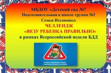 В рамках недели безопасного движения организованный ГУОВДД МВД России совместно с газетой «Добрая Дорога Детства» наш детский сад принял участие в челлендже по профилактике дорожно – транспортного травматизма с целью напомнить взрослым о необходимости перевозки детей в легковых автомобилях с использованием детских удерживающих устройств и ремней безопасности (в соответствии с возрастом). Безопасность юных пассажиров зависит от взрослых, которые находятся за рулем автомобиля. Большинство родителей сейчас используют детские удерживающие устройства (автокресла, бустеры) и ремни безопасности при перевозке детей. Между тем, использование детских удерживающих устройств и ремней безопасности значительно снижает вероятность гибели и тяжелых ранений юных пассажиров в ДТП.