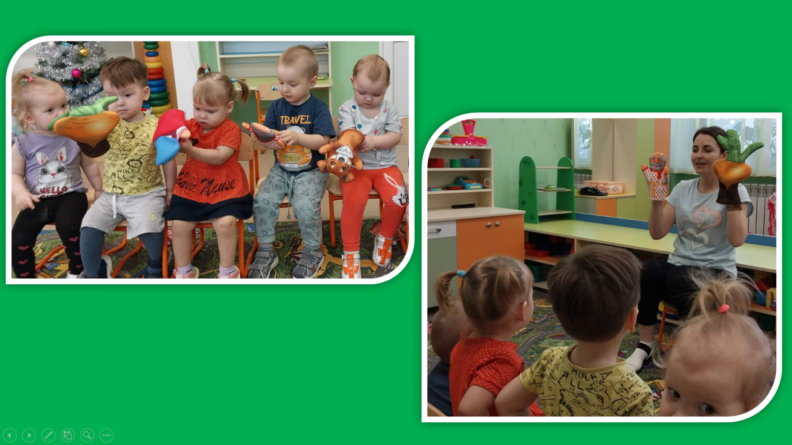 Театральная деятельность является одним из самых распространенных видов детского творчество, которая близка и понятна ребёнку. В режимных моментах воспитатель 1 младшей группы Сидорова Анна Анатольевна, знакомит своих малышей с русским народными сказками с помощью кукол бибабо. Яркие и красивые куклы на руке - лучшие спутники и друзья малышей!
