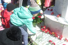 Накануне великого праздника Дня Победы, наши дети (подготов. гр. № 2, воспитатель Хуснутдинова Л.Н.) ходили к памятнику «Вечный огонь». Возлагая цветы павшим воинам – освободителям, дети вспоминали по рассказам взрослых, сколько горя и боли принесла война и обещали, что они вырастут достойными защитниками своей земли, постараются, чтобы ВОЙНЫ не было НИКОГДА!