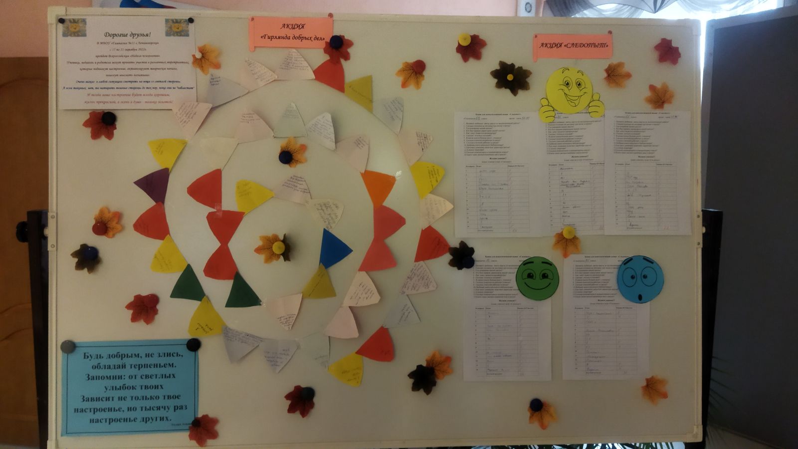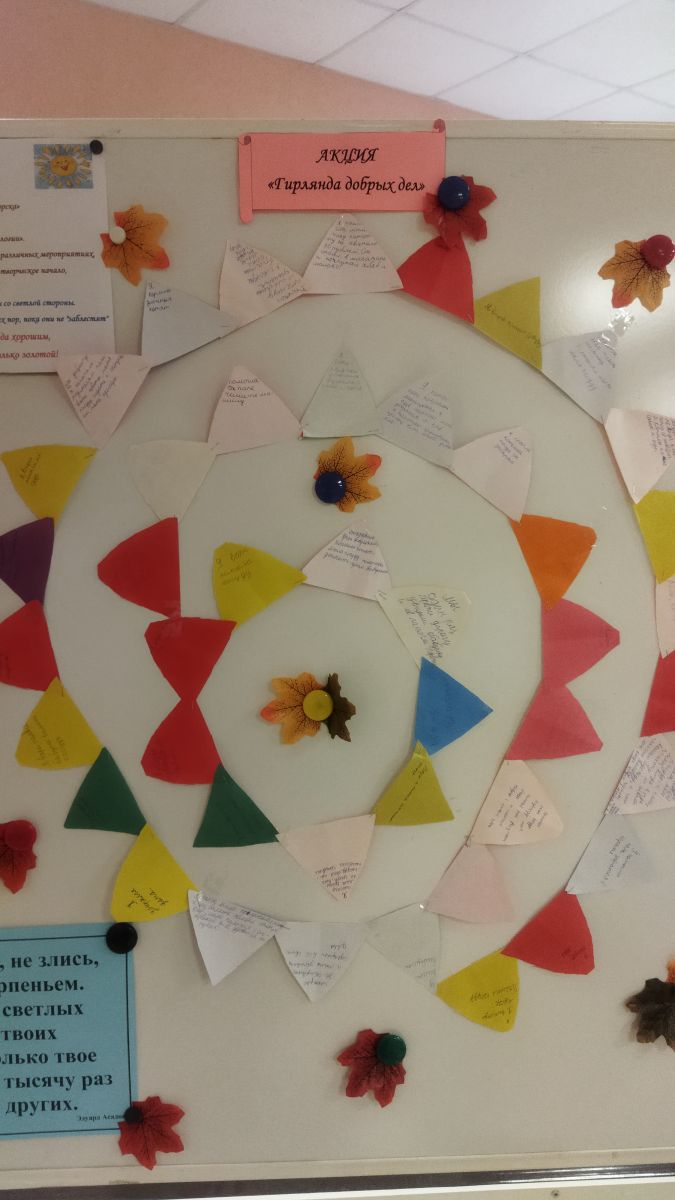 взаимодействия между учениками и работниками гимназии для учащихся 6-11 классов была проведена психологическая акция «Следопыт». А ученики 3 классов сделали «гирлянду добрых дел», на каждом жетоне которой были написаны добрые дела, которые они совершали.