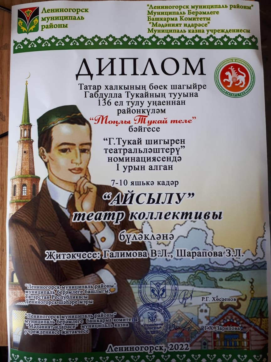 Татар теле һәм әдәбияты атналыгы кысаларында, 25 нче апрель көнне 6в сыйныф укучылары “”Син Тукайны беләсеңме?” дигән “Тамчы-шоу” интеллектуаль уенда катнаштылар. Ярышта“Айзирәкләр” һәм “Тапкырҗаннар”командалары Г.Тукайның тормышы һәм иҗатына кагылышлы темаларга көч сынаштылар, аның әсәрләрен сәнгатьле итеп сөйләделәр. Чара укучылар өчен кызыклы һәм файдалы булды